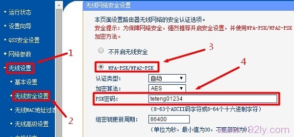 點(diǎn)擊“無線設(shè)置”——>“無線安全設(shè)置”——>選擇“WPA-PSK/WPA2-PSK”——>設(shè)置“PSK密碼”——>點(diǎn)擊“保存”。