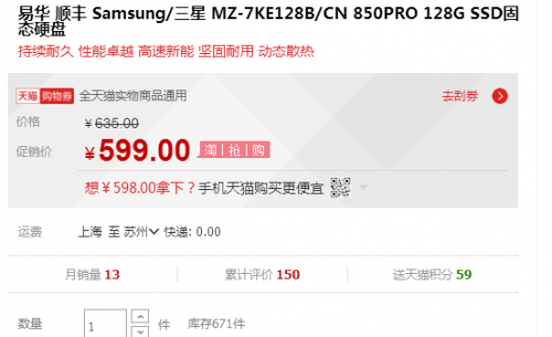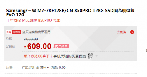 天貓上128G三星固態(tài)硬盤普遍需要599元,個別款式需要609元,若在實體店購買,可能更貴些