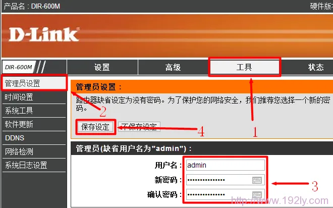 3、進入設(shè)置界面后,選擇“工具”菜單下的“管理員設(shè)置”,在此頁面可以找到“用戶名”選項。在此處輸入新的管理員用戶名,并設(shè)置一個個人專屬的登錄密碼,最后記得點擊頂部的“保存設(shè)定”按鈕保存更改。