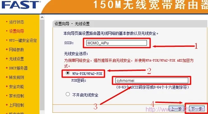 5、配置無(wú)線網(wǎng)絡(luò):設(shè)定“SSID”(網(wǎng)絡(luò)名稱),在“無(wú)線安全選項(xiàng)”中選擇“WPA-PSK/WPA2-PSK”,并自定義設(shè)置“PSK密碼”——>“下一步”。