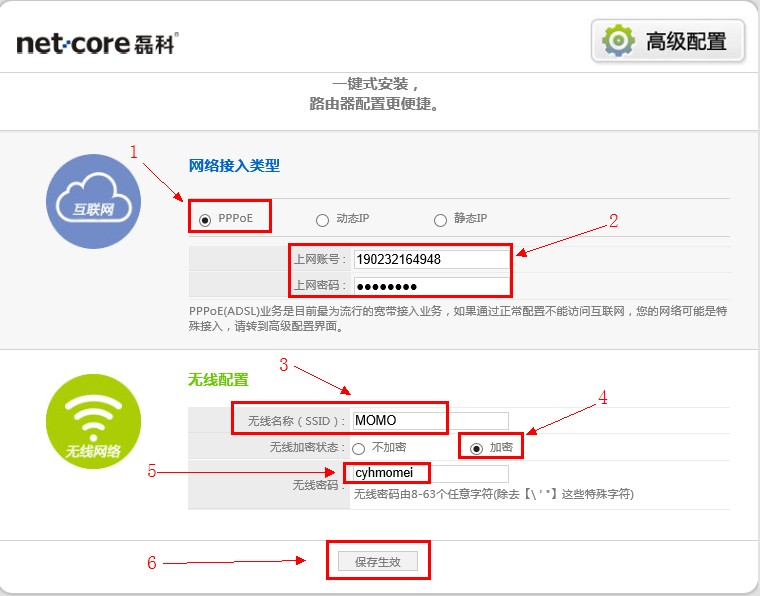 2、在“網(wǎng)絡(luò)接入類型”選項(xiàng)中選擇“PPPoE”——>填寫寬帶服務(wù)商提供的“上網(wǎng)賬號(hào)”和“上網(wǎng)密碼”——>在“無線配置”部分的“無線名稱(SSID)”處輸入無線網(wǎng)絡(luò)的名稱——>在“無線加密狀態(tài)”后選擇“加密”——>在“無線密碼”處設(shè)置一個(gè)較為復(fù)雜的密碼——>最后點(diǎn)擊“保存生效”按鈕。