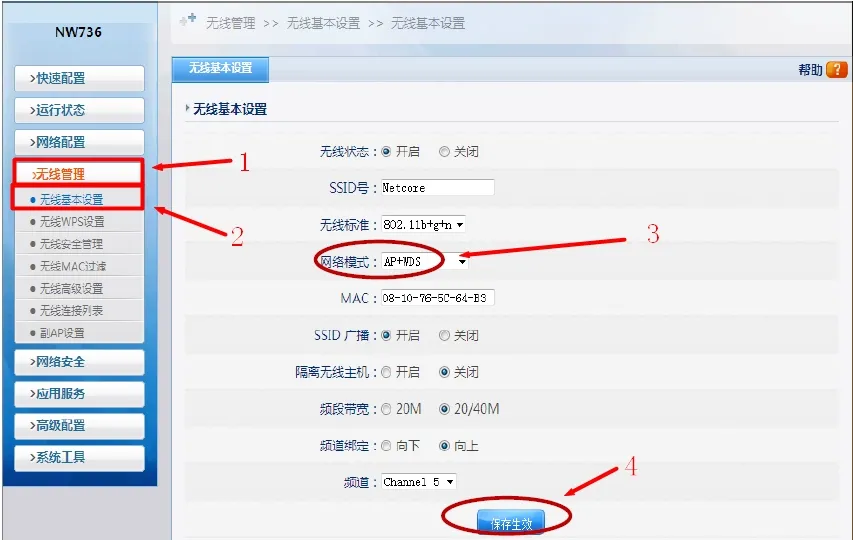 1、修改SSID及無線模式:進入管理界面——>選擇“無線管理”——>點擊“無線基本設置”——>修改“SSID號”以區(qū)別于路由器B(可改為Netcore-B)——>選擇“網絡模式”為“AP+WDS”——>點擊“保存生效”。
