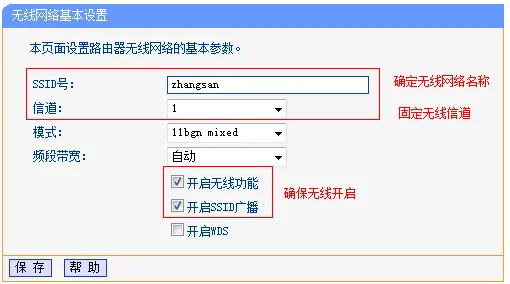 1、進入主路由器A的管理界面后,依次點擊“無線設置”——>“基本設置”,在此設置“SSID號”,請注意SSID名稱避免使用中文字符——>“信道”選擇為1——>勾選“開啟無線功能”、“開啟SSID廣播”——>最后點擊“保存”。