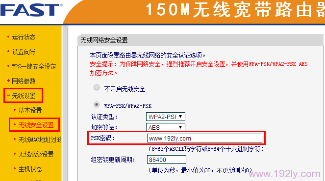 2、進(jìn)入管理頁面后,依次點(diǎn)擊“無線設(shè)置”——>“無線安全設(shè)置”——>找到“PSK密碼”,這里顯示的就是當(dāng)前無線路由器的WiFi密碼。