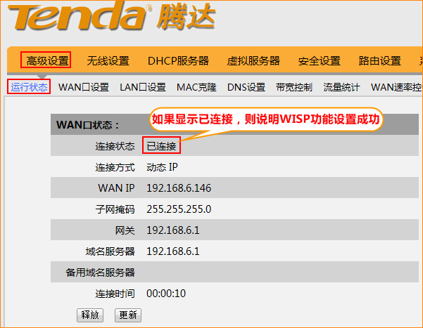 第六步,回到“高級設(shè)置”——> “運(yùn)行狀態(tài)”,檢查“WAN口狀態(tài)”,如顯示“已連接”,則表明WISP模式配置成功,此時無線設(shè)備即可通過騰達(dá)W3000R路由器上網(wǎng)。