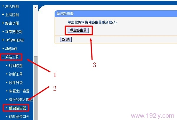 完成設(shè)置后,建議重啟路由器以使更改生效。可以通過(guò)拔掉電源再接通的方式重啟,或者直接在設(shè)置界面點(diǎn)擊重啟按鈕,如下圖所示: