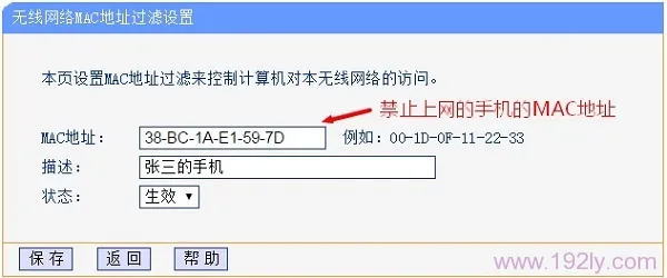 2、在“MAC地址”框內(nèi)輸入需要限制的手機的MAC地址——> “描述”字段可自由填寫,例如“李四的手機”——> 最后點擊“保存”按鈕。