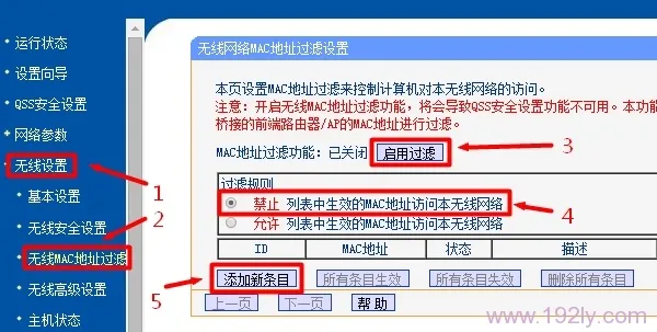 1、導(dǎo)航至“無線設(shè)置”——> “無線MAC地址過濾”——> 將“MAC地址過濾功能”設(shè)為:開啟過濾——> “過濾規(guī)則”選擇:阻止列表中的MAC地址訪問網(wǎng)絡(luò)——> 點擊“新增條目”按鈕。