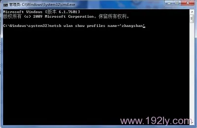 2、在CMD命令提示符窗口中,輸入:netsh wlan show profiles name=”要刪除的WiFi熱點記錄名稱”,例如本例需刪除“zhangshan”這個WiFi熱點記錄,則應(yīng)輸入:netsh wlan show profiles name=”zhangshan”,然后按下鍵盤上的回車鍵即可完成操作: