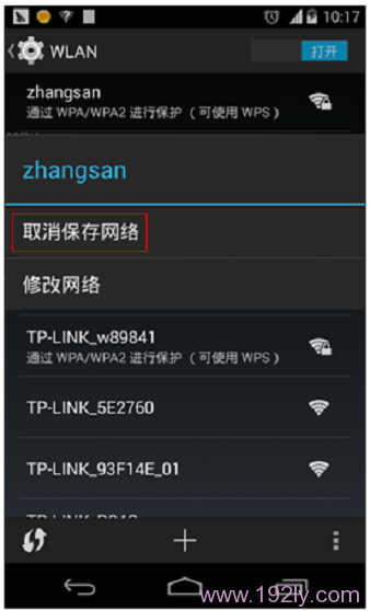 進(jìn)入WLAN設(shè)置頁面,選中需刪除的WiFi信號(例如“zhangshan”),長按后選擇“取消保存網(wǎng)絡(luò)”或類似選項(xiàng)以移除記錄。