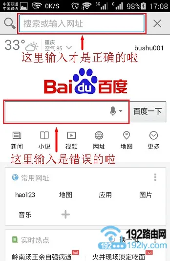 (2)、有些手機(jī)瀏覽器,打開后頁面有一個(gè)百度、360之類的搜索框。不要在搜索框中輸入路由器設(shè)置網(wǎng)址,是打不開設(shè)置頁面的。而要在瀏覽器最上方顯示網(wǎng)址的位置輸入,才可以打開。