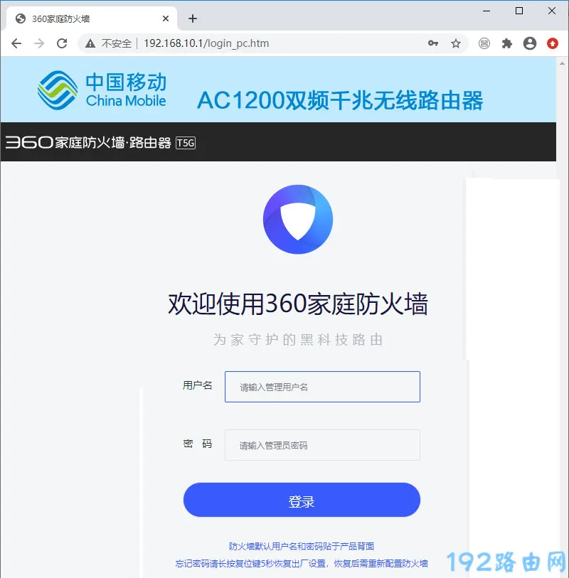 2. 接下來(lái),在電腦或手機(jī)的瀏覽器地址欄內(nèi)輸入 wifi.cmcc 或 192.168.10.1中的任一地址,即可跳轉(zhuǎn)至路由器的登錄界面。在此頁(yè)面輸入正確的用戶(hù)名與密碼,便可進(jìn)入路由器的設(shè)置頁(yè)面。