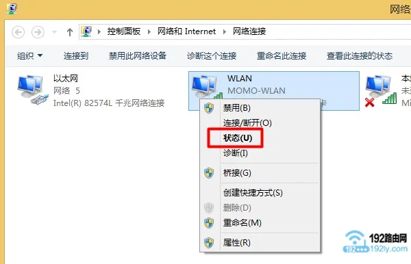 (3)在網(wǎng)絡(luò)連接設(shè)置頁面里,右鍵點(diǎn)擊“以太網(wǎng)”或者“WLAN”,然后選擇“狀態(tài)”選項(xiàng)。