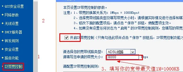 3、啟用并配置IP寬帶控制功能:點(diǎn)擊“IP寬帶控制”選項(xiàng)—>勾選“啟用IP寬帶控制”—>在“請?zhí)顚懩暾埖膸挻笮 币粰谔钊肽膶?shí)際寬帶速率(例如1M等于1000KB)。