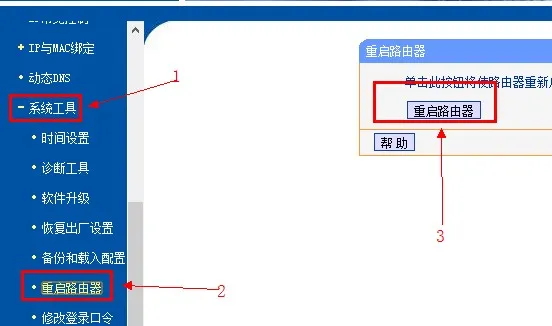 5、重啟路由器以應(yīng)用更改:轉(zhuǎn)至左側(cè)菜單中的“系統(tǒng)工具”—>選擇“重啟路由器”—>點(diǎn)擊“重啟路由器”按鈕—>再次點(diǎn)擊“確定”。重啟后,之前設(shè)置的限速策略即刻生效。