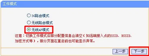 3、設(shè)定工作模式:在“工作模式”選項(xiàng)中選擇“無線AP模式”–>點(diǎn)擊“下一步”。