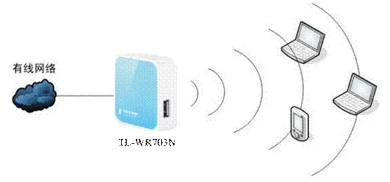 通過網(wǎng)線將TL-WR703N連接至有線網(wǎng)絡(luò),它可以與網(wǎng)絡(luò)中的路由器或交換機(jī)相接。例如,在酒店或賓館的房間內(nèi),只需將TL-WR703N插入房間內(nèi)的網(wǎng)絡(luò)接口即可。隨后進(jìn)行必要的配置,便可將原本的有線網(wǎng)絡(luò)轉(zhuǎn)化為支持無線連接的形式。