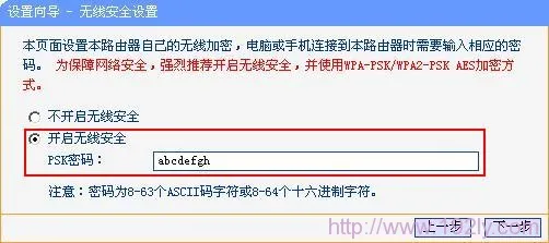 6、設(shè)置TL-WR700N的PSK密碼:選擇“開啟無(wú)線安全”–>在“PSK密碼”后設(shè)置自己的密碼,例如abcdefg–>“下一步”。