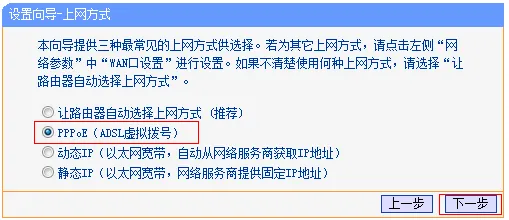 3、選擇上網(wǎng)模式:選擇“PPPoE(ADSL虛擬撥號(hào))”——>點(diǎn)擊“下一步”。