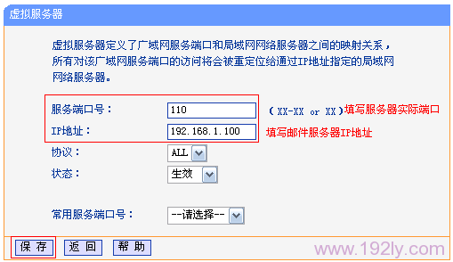 (2)、配置接收郵件的端口映射規(guī)則:“外部端口號”填寫:110——>“內(nèi)部端口號”填寫:110——>“IP地址”填寫:192.168.1.100——>“保存”