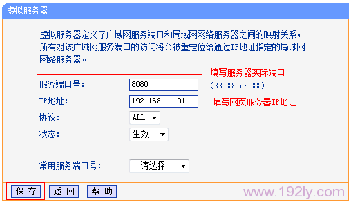 “外部端口號”填寫:8080——>“內(nèi)部端口號”填寫:80——>“IP地址”填寫:192.168.1.101——>“保存”