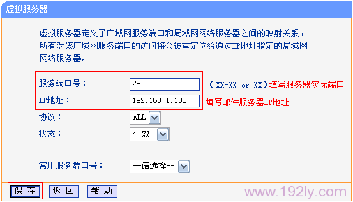 (1)、配置發(fā)送郵件的端口映射規(guī)則:“外部端口號”填寫:25——>“內(nèi)部端口號”填寫:25——>“IP地址”填寫:192.168.1.100——>“保存”