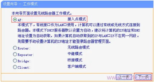 2、選定工作模式:在此處需選擇“AP:接入點(diǎn)模式”——>點(diǎn)擊“下一步”。