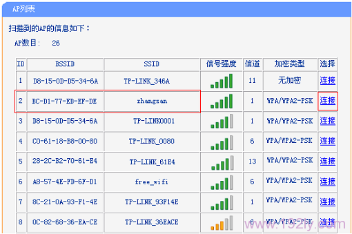 4、在掃描結(jié)果頁(yè)面中,找到需要被中繼的無(wú)線信號(hào)名稱(例如:zhangsan),然后點(diǎn)擊“連接”。