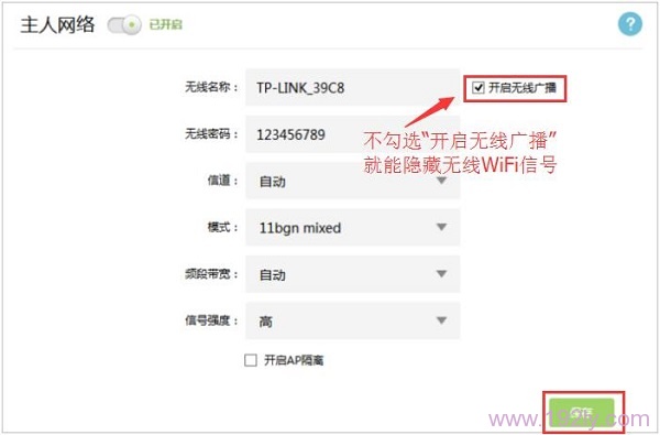 (2)在設(shè)置頁面中找到“開啟無線廣播”選項,取消勾選該選項——>點擊“保存”。如圖所示,這樣就能成功隱藏TL-WDR5600路由器的2.4G無線WiFi信號。
