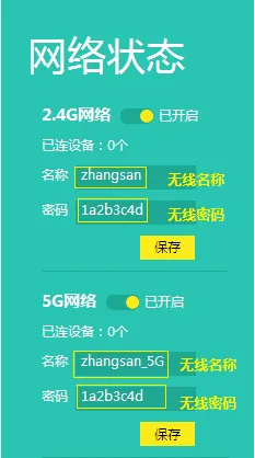 登錄后,在頁面左側(cè)找到“網(wǎng)絡(luò)狀態(tài)”,在此處可直接修改無線名稱和密碼,并點擊“保存”完成設(shè)置。