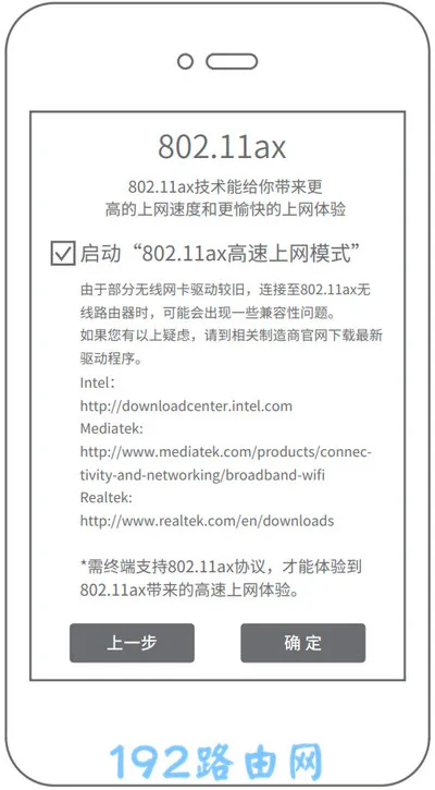 (6)默認(rèn)開啟“802.11ax高速上網(wǎng)模式”,點擊“確定”,完成整個設(shè)置流程。