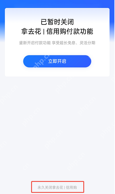 8、頁面會(huì)提示已暫時(shí)關(guān)閉,此時(shí)需要點(diǎn)擊底部的【永久關(guān)閉拿去花|信用購】,才能徹底關(guān)閉攜程拿去花服務(wù)。