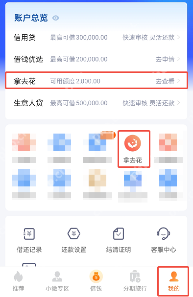 1、首先,啟動(dòng)攜程金融應(yīng)用程序,點(diǎn)擊屏幕右下角的【我的】選項(xiàng),進(jìn)入到【拿去花】頁面;