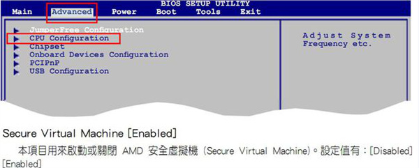 2、找到“Advanced”,選擇“CPU Configuration”,點(diǎn)擊“Secure Virtual Machine” 選項(xiàng)(或SVM Mode)。