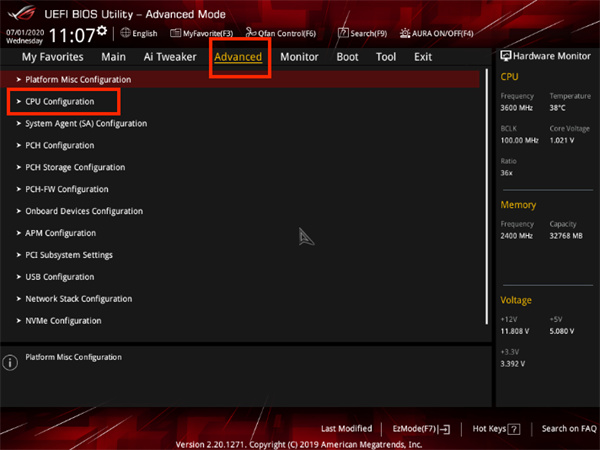 2、選擇“Advanced Mode”。點(diǎn)擊“Advanced(高級)”,找到“CPU Configuration(CPU設(shè)置)”。