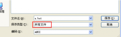 2,點擊保存,選擇所有文件,輸入文件名a.bat,然后點擊保存。