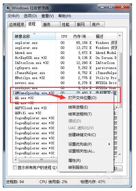 右擊“QMGameSpeedup.exe”選擇“打開(kāi)文件位置(O)”