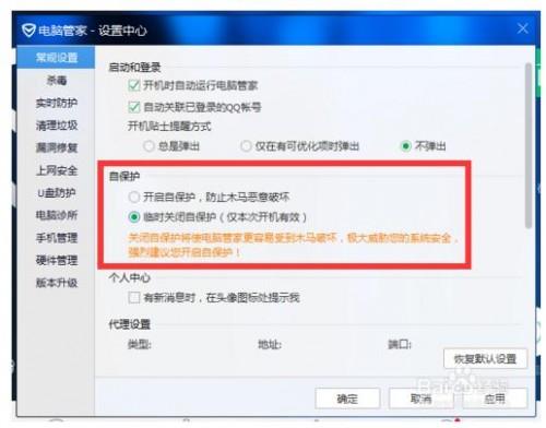 進(jìn)入電腦管家的設(shè)置中心,先關(guān)閉自保護(hù)