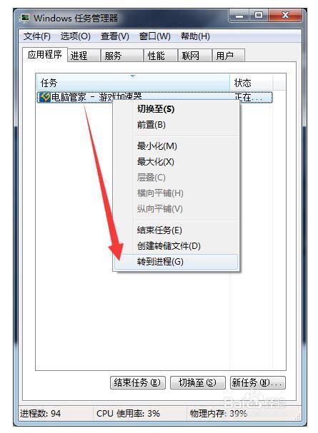 打開(kāi)任務(wù)管理器,在“應(yīng)用程序”標(biāo)簽頁(yè)中右擊“游戲加速”選擇“轉(zhuǎn)到進(jìn)程”
