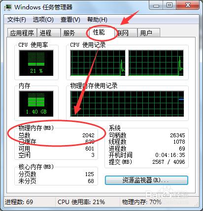 2.點擊性能,可以查看物理內(nèi)存大小,筆者的電腦物理內(nèi)存為2G。