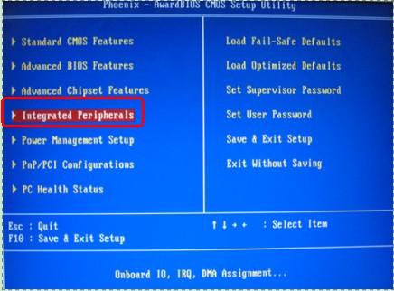 開機(jī)后,按“Delete”鍵或者“F10”鍵進(jìn)入CMOS,使用小鍵盤的方向按鍵選擇“Integrated Peripherals”,按下“Enter”鍵,如圖(3);