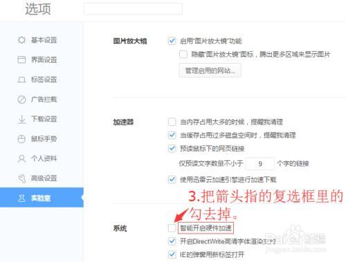 3.把“開啟智能硬件加速”前面的復(fù)選框里的勾點去。(如果復(fù)選框里面本來就沒有勾,就不用管)