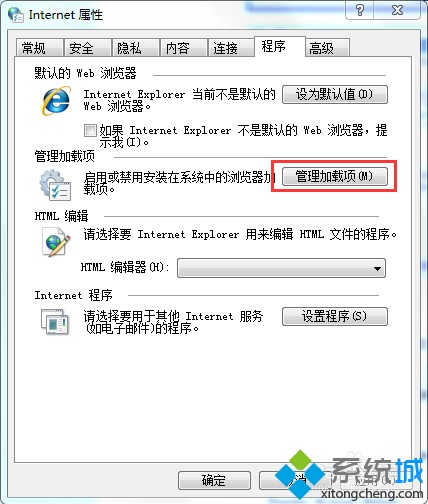 4、如果是由于某些程序或插件出錯,則在“程序”選項(xiàng)卡下,點(diǎn)擊“管理加載項(xiàng)”按鈕;