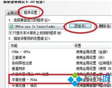 3、如果不想修改全局設(shè)置,則在程序設(shè)置下添加瀏覽器路徑,然后再將下方的“平滑處理-FXAA”關(guān)閉即可。