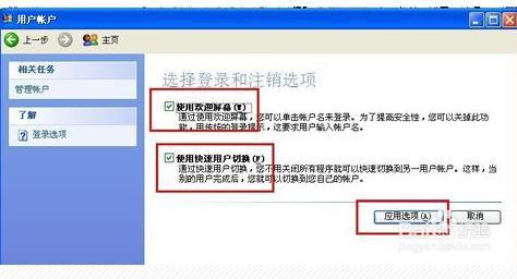 4、然后看到里面有兩個選項,都勾選一下,勾選后點擊“應(yīng)用選項”按鈕。這樣有利于我們切換用戶,不然切換用戶很可能會關(guān)閉自己本來用戶程序等麻煩。