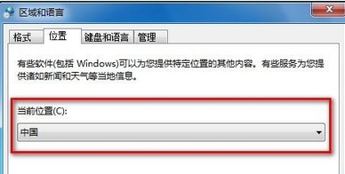 3.之后彈出區(qū)域和語言的設置窗口,咱們將界面切換到位置這一欄,然后下面的當前位置就可以供我們操作更改了,大家想設置到哪個位置就直接在這里選擇就是了。設置好之后記得點擊下方的確定按鈕保存哦。