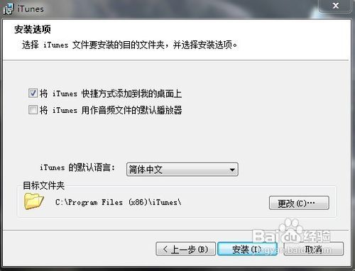 4、下載完畢之后,雙擊安裝包開始安裝,過程比較簡(jiǎn)單,其中是否要將“iTunes作為音頻的默認(rèn)播放器”這個(gè)建議不選擇,畢竟iTunes過于臃腫了,況且很多人都已經(jīng)有自己專門的音頻播放器