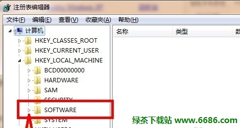 3、進(jìn)入注冊表,找到“HKEY_LOCAL_MACHINE”,請依據(jù)下圖指示,點(diǎn)擊紅色框內(nèi),箭頭所示的文件夾前的三角按鈕