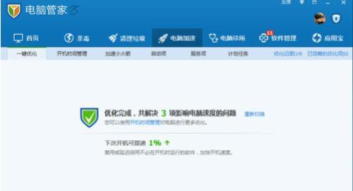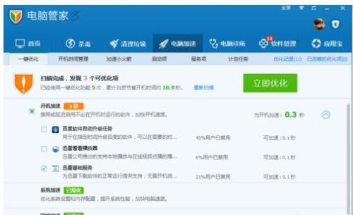 進入到騰訊電腦管家的電腦加速頁面后,我們可以看到我們電腦中拖慢電腦速度的一些程序,我們需要點擊騰訊電腦管家當(dāng)前頁面的優(yōu)化加速按鈕進行電腦優(yōu)化加速