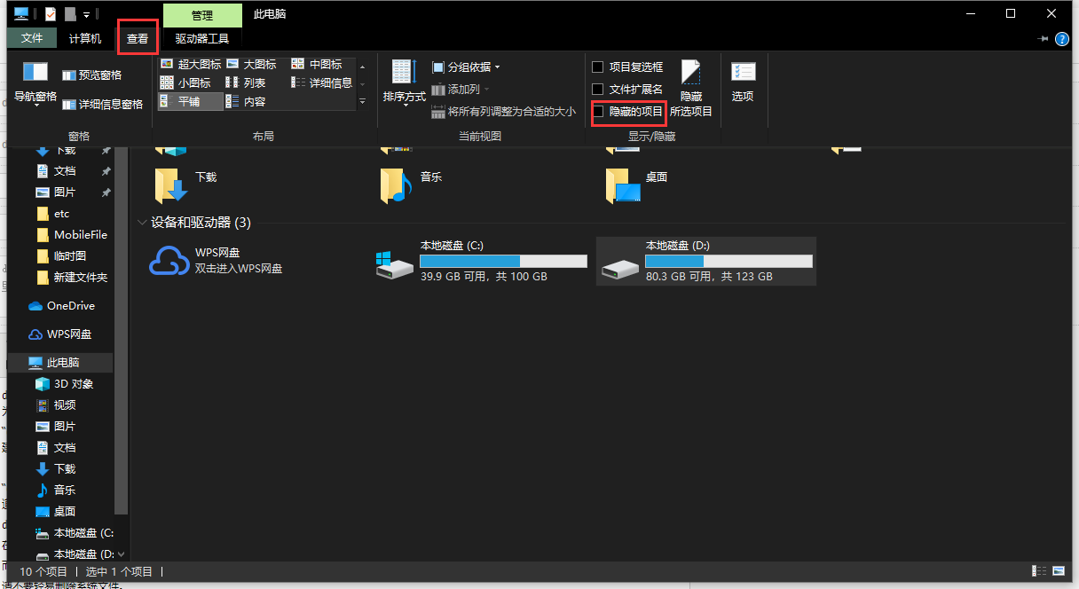 想要將系統(tǒng)文件隱藏起來,可以打開【此電腦】-【查看】-【隱藏的項目】,將隱藏的項目前面的勾選取消之后大家就無法看到隱藏文件了,一般情況下隱藏文件默認都是隱藏的。